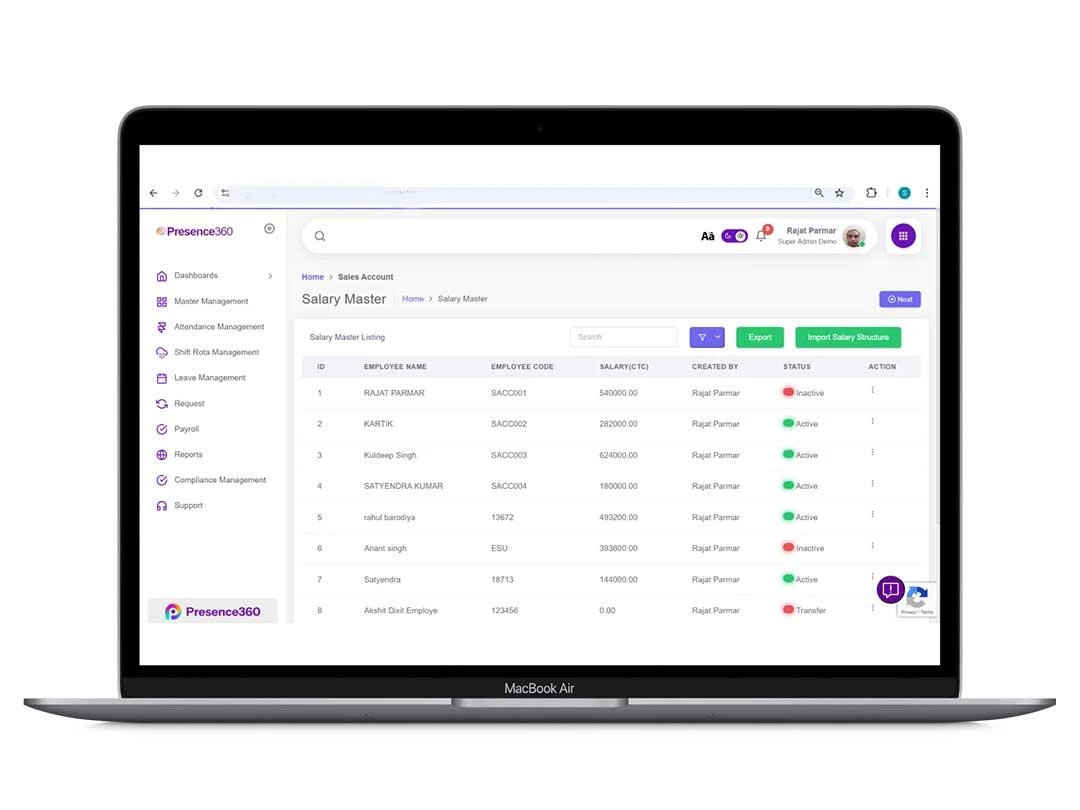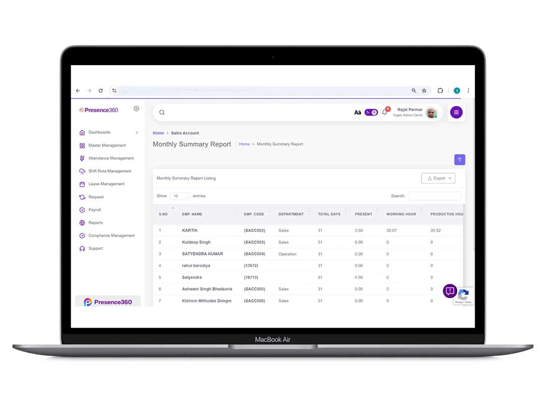 Presence360 is an intelligent, cloud-based HR software that simplifies your everyday HR tasks while putting employees first. Built with modern businesses in mind, it automates attendance (with facial recognition and proxy-proof technology), leave approvals, payroll, and performance reviews—everything your HR team needs, in one sleek dashboard.