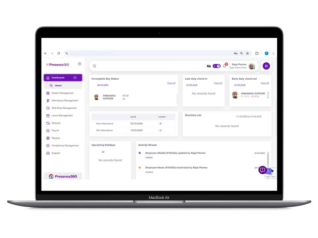 - Multi-Location, Multi-Device Support: Whether in HQ, Regional offices, or plants Presence360 keeps your HR synced everywhere.