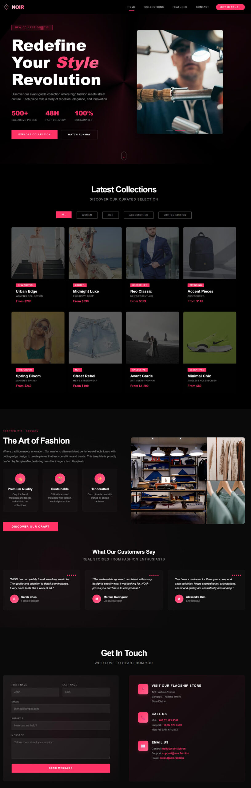 This template features an automatic hero carousel, category filtering system, smooth scrolling navigation, parallax effects, responsive design, contact form, and testimonials section. The sleek black (#0a0a0a) and hot pink (#ff3366) color theme exudes luxury and sophistication, while remaining easy to modify with Claude AI. Where tradition meets innovation. Our master craftsmen blend centuries-old techniques with cutting-edge design to create pieces that transcend time and trends. This template is proudly crafted by TemplateMo, featuring beautiful imagery from Unsplash.